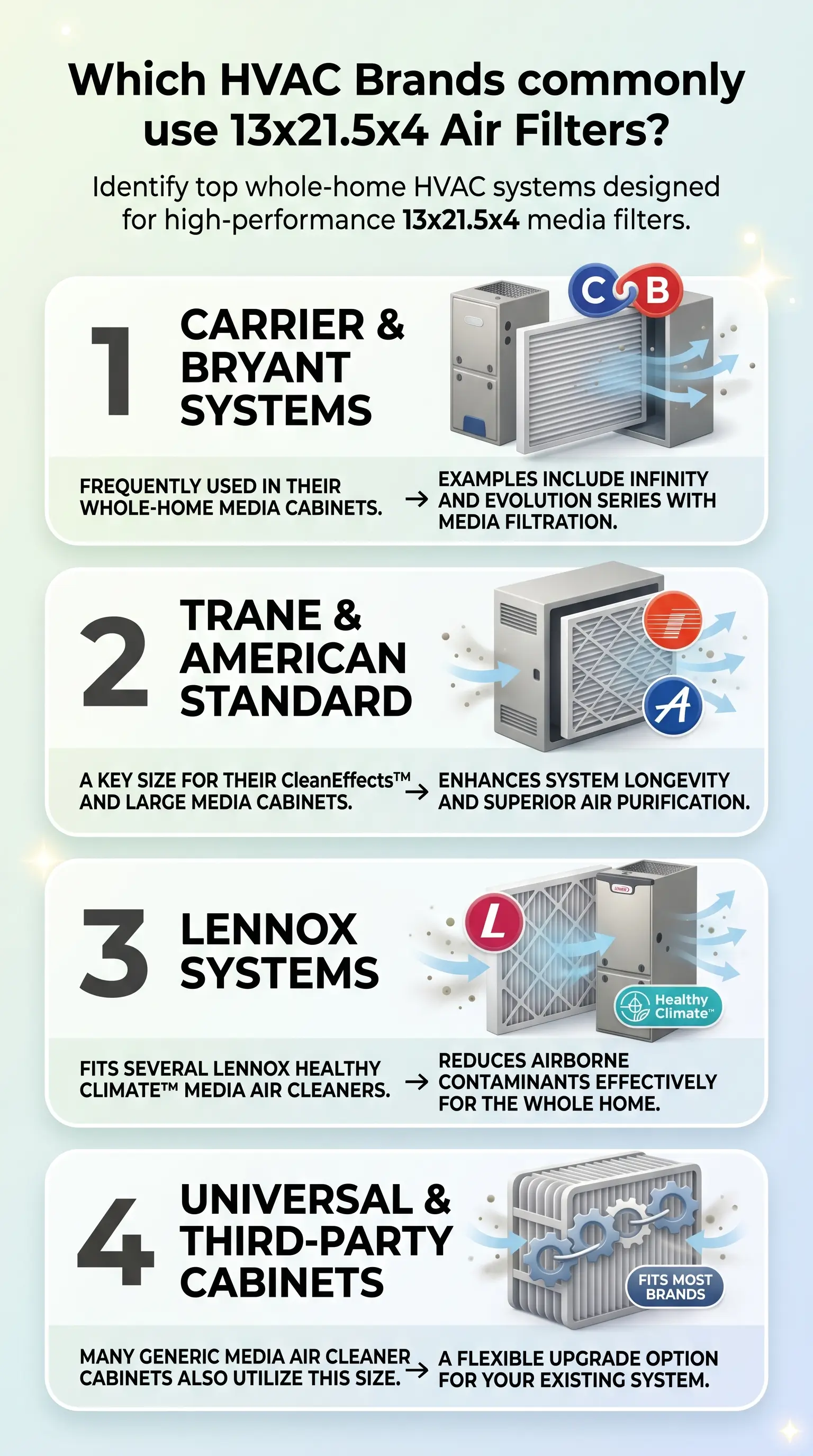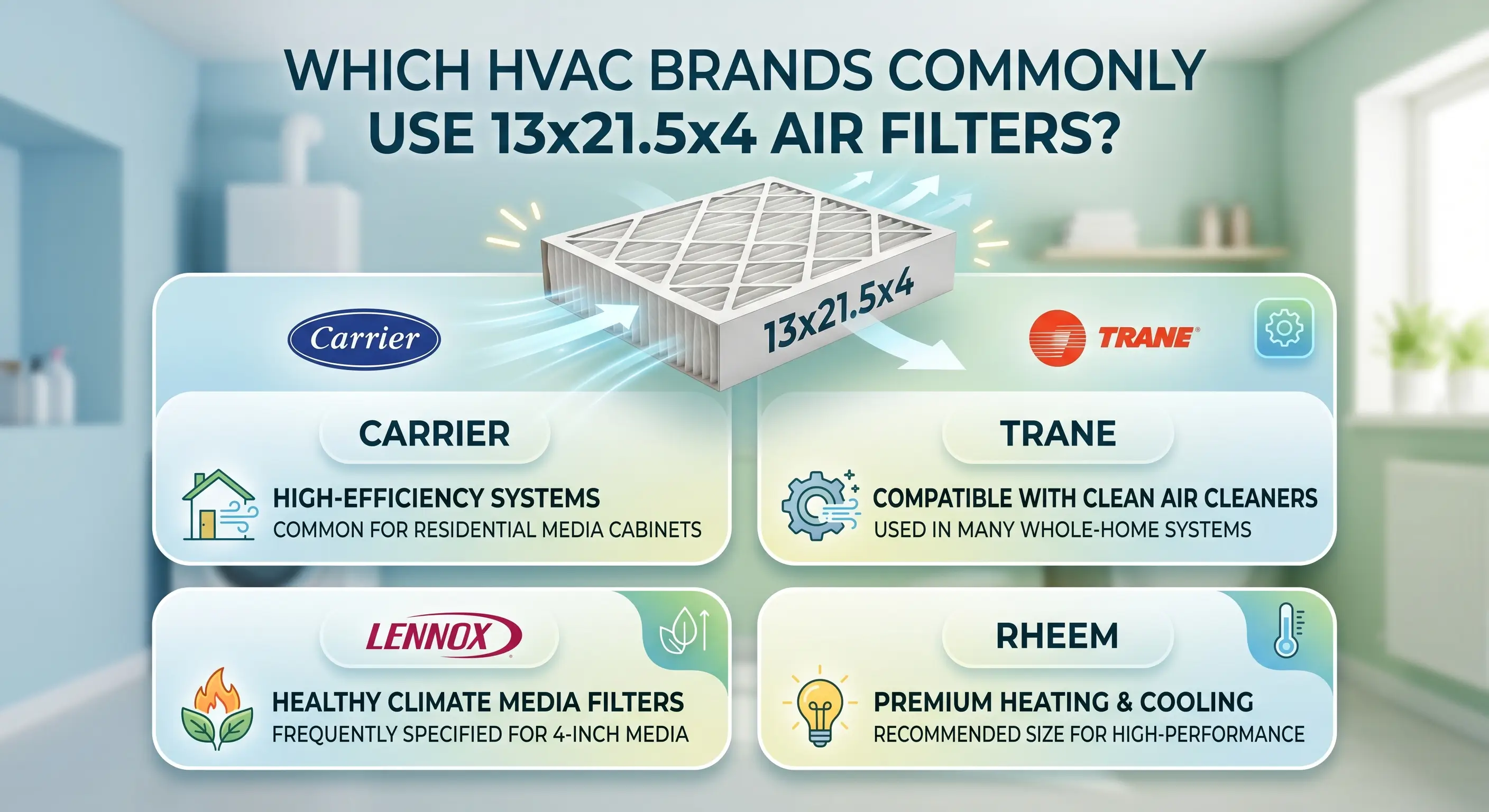 Pull off the filter-door panel on a Carrier-built air handler in the 1.5 to 2 ton class. There’s a good chance you’ll see “13x21.5x4” printed on the frame inside. That same size also shows up across Bryant, Payne, and Day & Night cabinets, all built on shared Carrier Corporation platforms, plus universal-fit aftermarket versions that slide into matching Trane, Lennox, Goodman, Rheem, York, and Ruud slots. If you’re pairing this filter with ionizing air purifiers in a humid Florida home, getting the right model family, the right MERV rating, and the right replacement cadence is what keeps your HVAC clean and your family breathing easy.